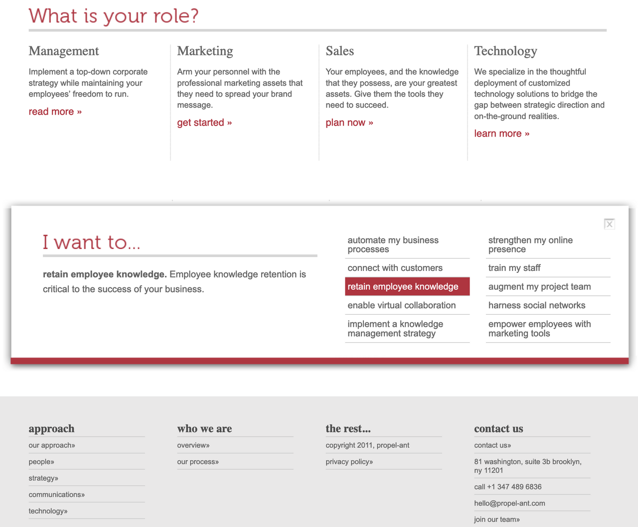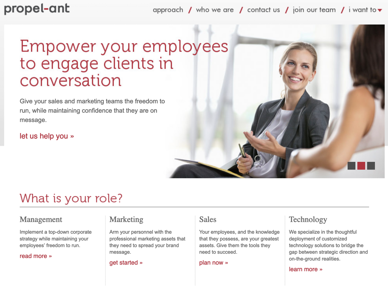 propel-ant is a consulting company specializing in problem solving, marketing, and technology solutions. They wanted a website that better reflected their full range of skills and specialties, with navigation that made it easy for visitors to the site to find what they were looking for.